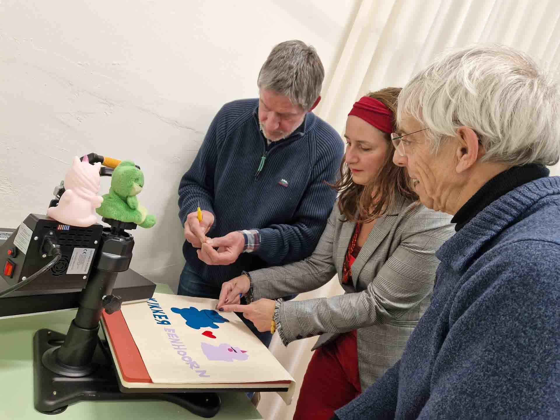 En zo kwam het ervan die middag dat 3 grote mensen Kikker en Eenhoorn en mij aan het helpen waren om de tas af te maken. De meneren bedienden de pers en Anne hielp alles precies te leggen zoals Kikker het wilde.