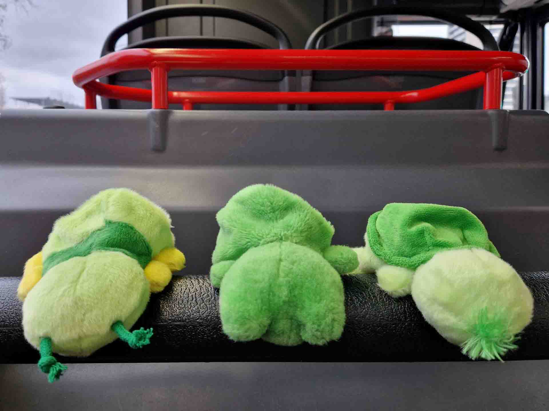 Daarna was het tijd voor een korte pauze op ’t bankje bij de bushalte. Het bankje had allemaal handjes in mozaiek ingelegd, waardoor ze geïnspireerd werden om even met zijn drieën “En nou die hèndjes de lucht in!” te zingen. Een liedje wat vooral voor rupsje 2x zo hard werken betekent, omdat hij er 4 heeft om de lucht in te steken.