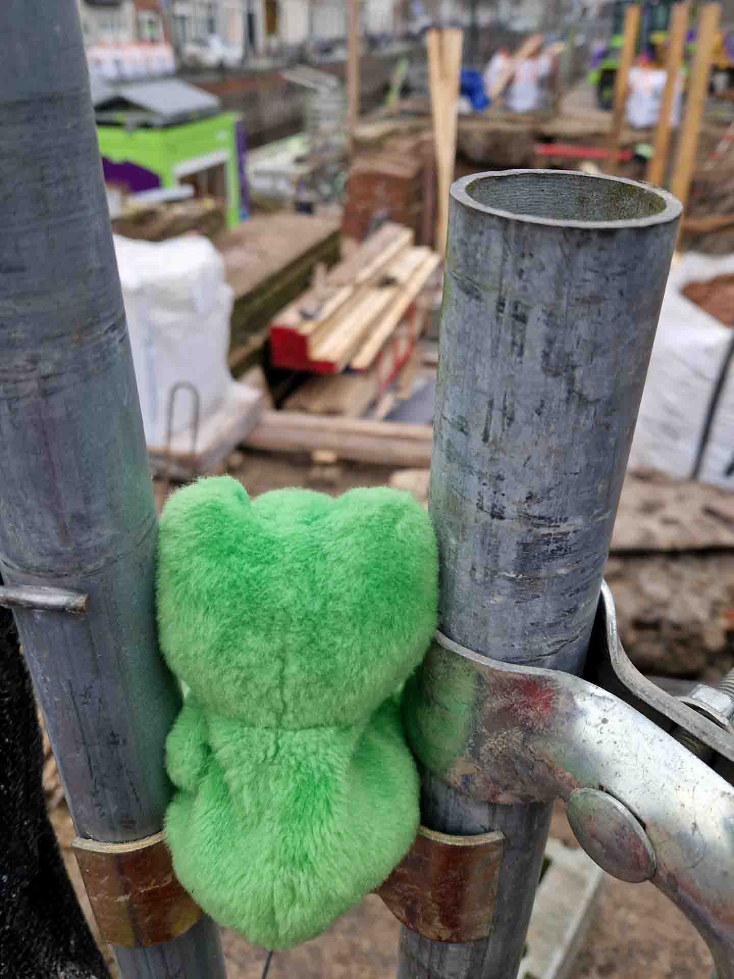 Kunst kijken maakt hongerig. Daarom wilden we om de hoek bij Huis73 iets gaan eten. Onderweg daarheen keek Kikker even naar de bouwkeet boven het water. “Mooi groen is niet lelijk!” grapte hij.