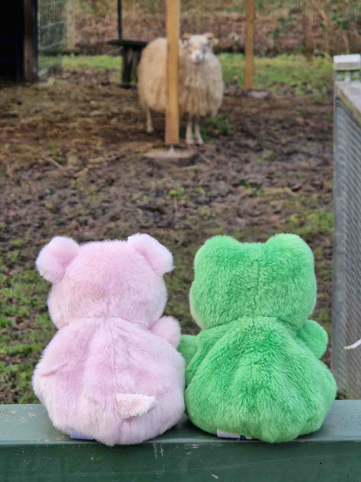 Samen liepen ze verder naar de knuffelweide. Eenhoorn moest even buiten het hek wachten. Kikker en Biggy mochten door. Maar er was geen varkentje in de weide en het schaap wat er was bleef op afstand.
