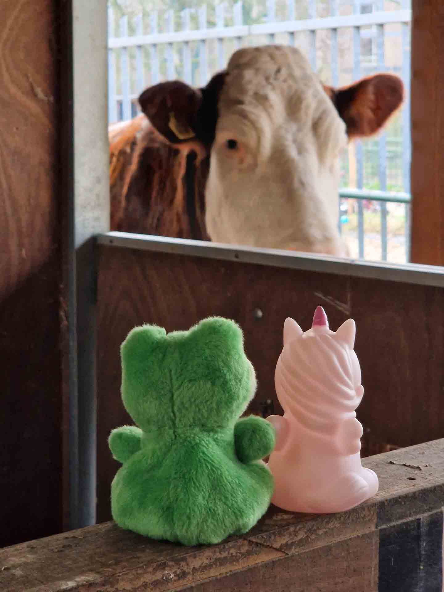 De andere 2 waren teruggekomen, maar hadden alles gemist. Ze zagen alleen de koe nog even. Die was zo groot, dat Kikker voor de zekerheid een beetje achter Eenhoorn kroop.